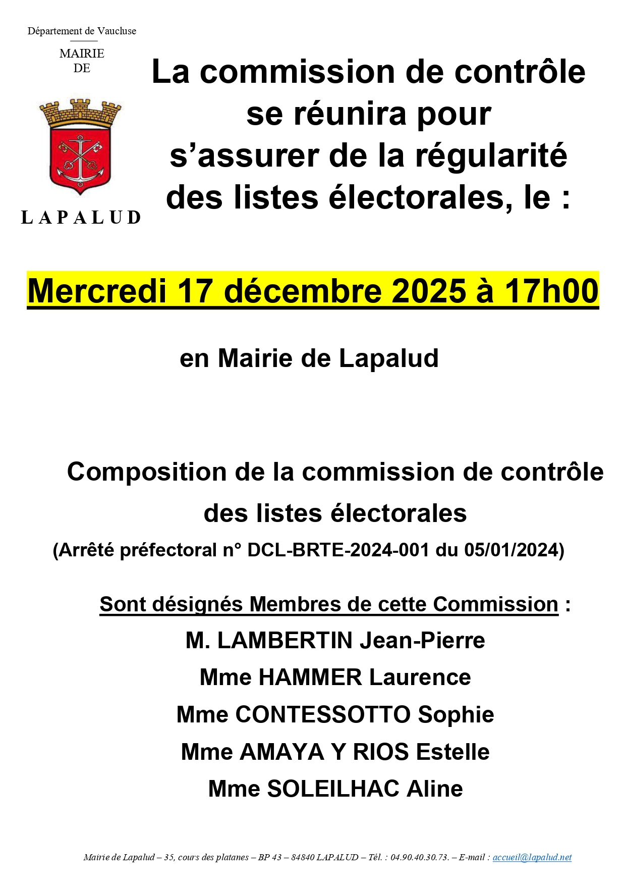 Commission de contrôle des listes électorales le 17 décembre 2025 à 17h00 en mairie